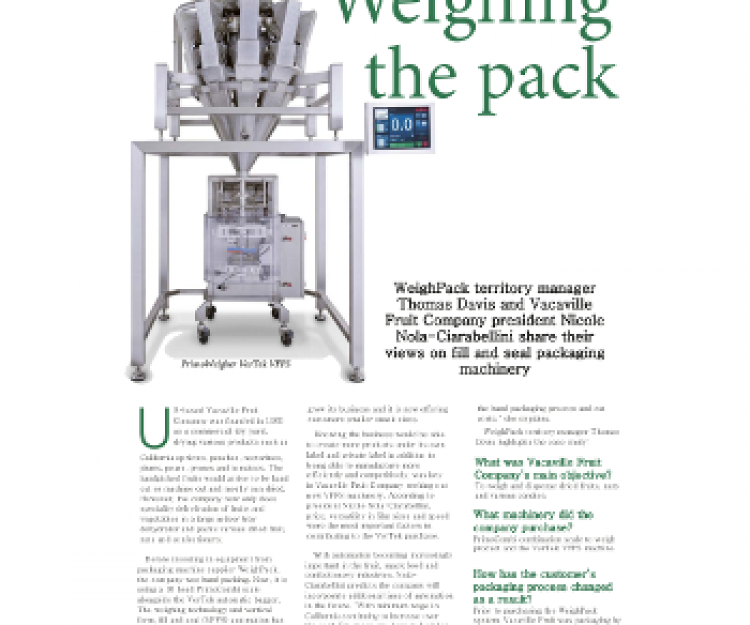 Articles 05 Jan 2018 Weighing the packWeighPack territory manager Thomas Davis and Vacaville Fruit Company president Nicole Nola-Ciarabellini share their views on fill and seal packaging… Thiru