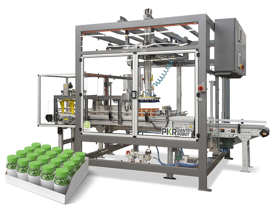 - It has a gantry robot that picks up the bottles from the conveyor belt and places them into the trays according to the predefined pattern.